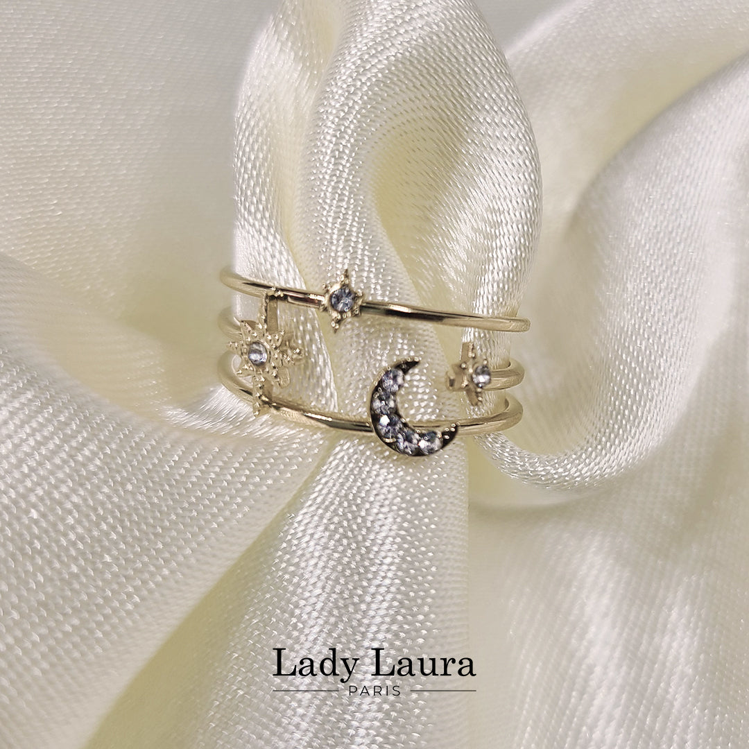 Prenez un rayon de lune et de mystère avec la bague Lady Jasmine. Une splendide pièce qui vous attirera des regards envieux grâce à sa lune et ses étoiles scintillantes. Revêtez-vous d'un air de glamour avec cette merveilleuse bague. Alors, prêt à chanter ses louanges ?